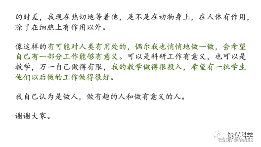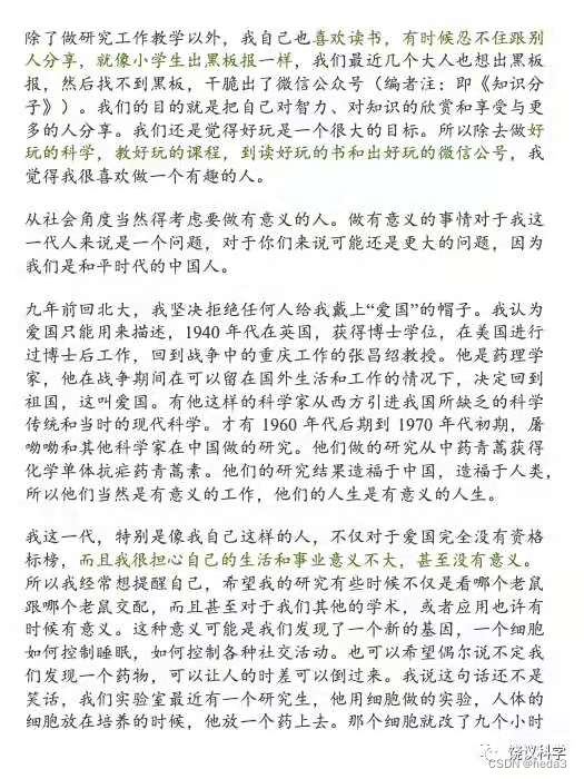 从社会角度阐述,做有意义的人,例如研究成果造福于中国、造福于人类(屠呦呦青蒿素抗疟药)、研究方面(通过基因控制睡眠、控制各种社交活动、让人的时差倒过来等)或者是教学方面做的很投入,有一批学生以后能做的更好。