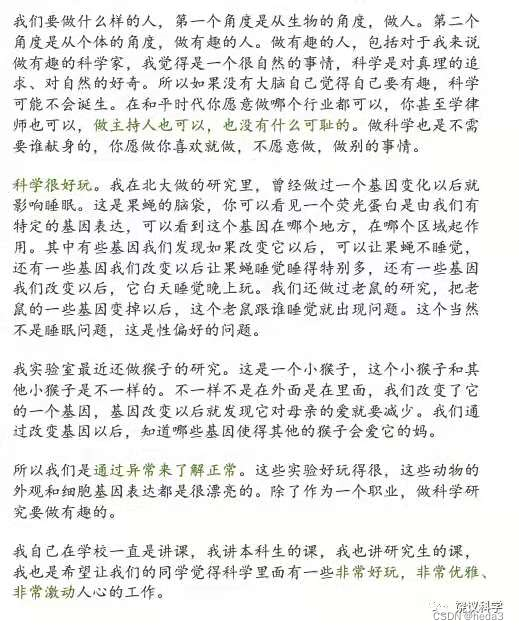 从个体角度阐述,做有趣的人,比如做有趣的科学家,科学是对真理的追求、对自然的好奇,从而论证做一个有趣的人:讲到具体的研究,从基因表达(果蝇、老鼠、猴子,通过改变基因表达从而表现不同的行为)阐述了科学的奇妙好玩之处,以及对知识的欣赏和享受与更多人分享,并抽象升华,不仅仅是局限于好玩,从社会角度阐述要做有意义的人。