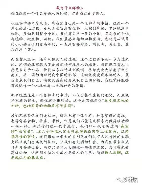 从生物角度阐述,做人,阐述了人进化的历史演变过程,我们人和动物最大的区别是大脑,其实从我们以前的教科书上也可以佐证这个观点:我们人和动物的区别是是否会使用工具。也即是思考能力/思想意识。