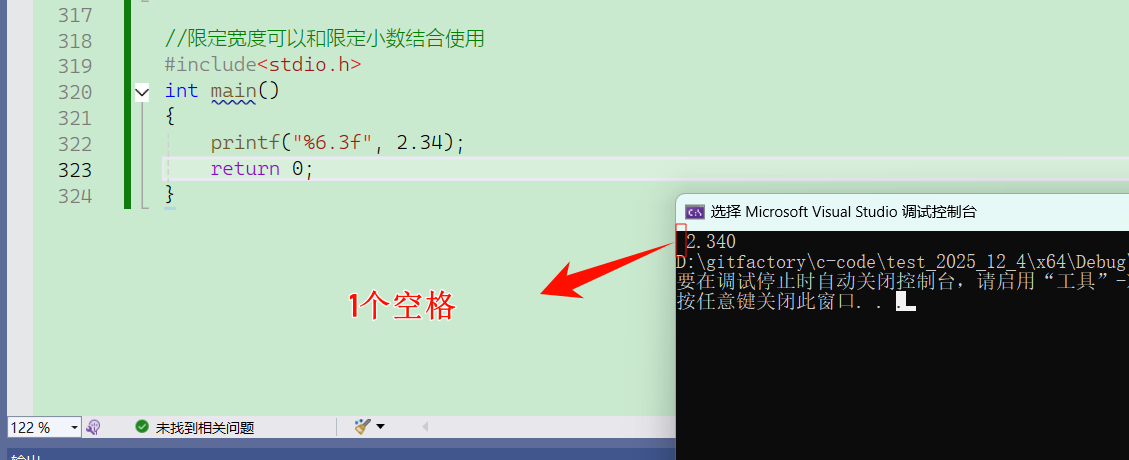 上述示例中,小数占3位,小数点占1位,整数部分占一位,总共有5位,不足6位,末尾是右对齐,所以在该数的前面加一个空格