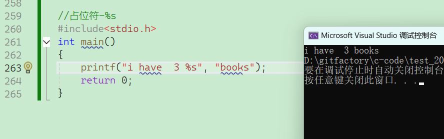 在上述的示例中,i have %d books 就是输出文本,里面的%d就是占位符,表示这个位置要用其他值来替换。占位符的第一个字符一律用