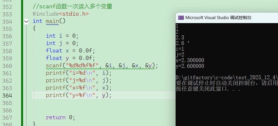 上述代码中,格式字符串%d%d%f%f,表示用户输入的前两个值是整数,后两个值是浮点数。我在上述代码执行过程中输入了:1 2 2.3 2.6