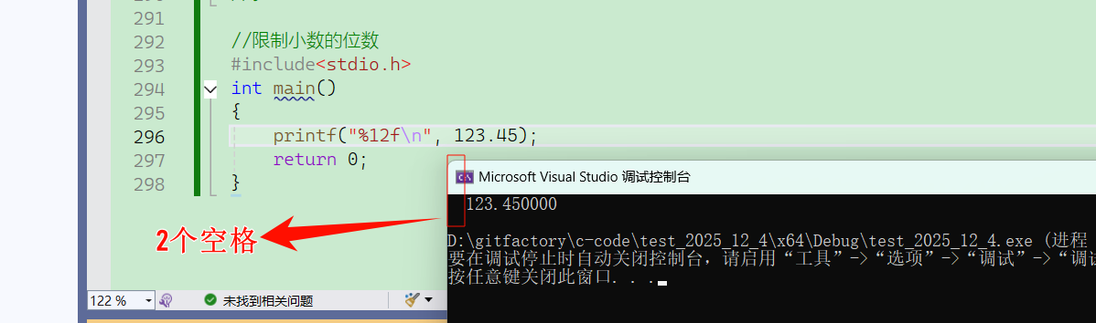 分析:%12f表示输出的浮点数最少要占据12位。由于小数的默认显示精度是小数点后6位,所以123.45输出结果的头部会添加2个空格(注意:小数点也占一位)