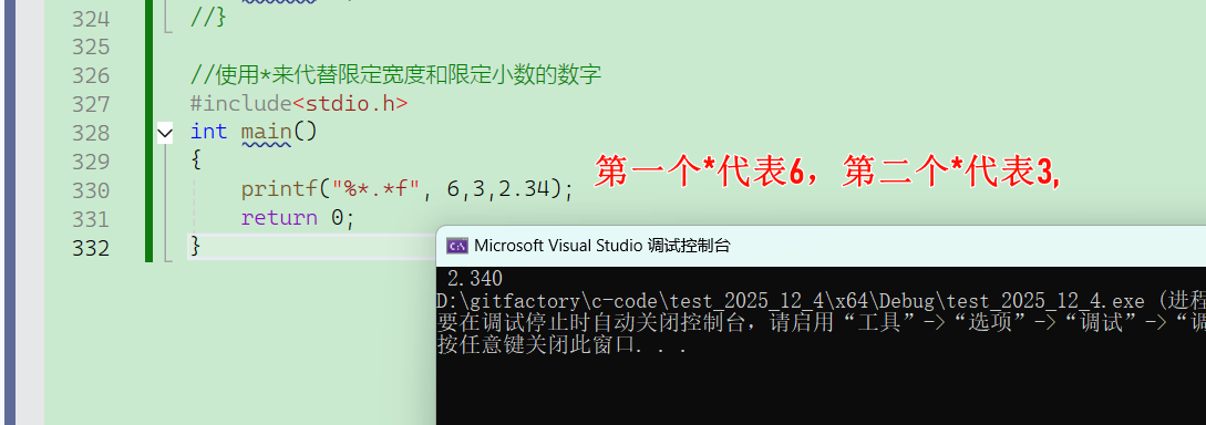 在限定宽度和限定小数结合使用时,可以用*分别来代替宽度和小数的位数,而两个*代表的数据可以通过printf函数参数来传入,然后代替