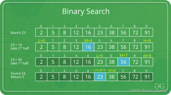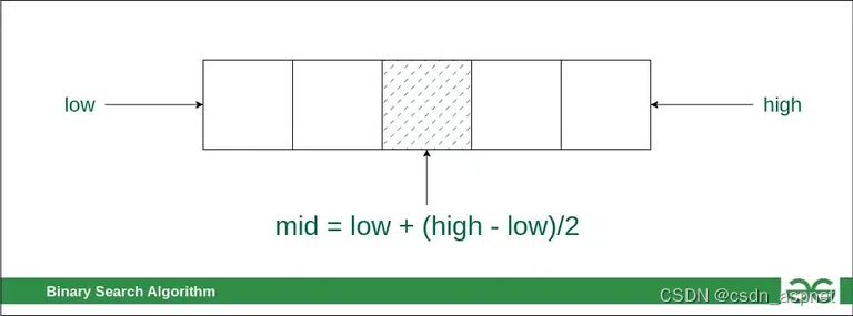 在这个算法中, 通过查找中间索引“mid”将搜索空间分为两半。