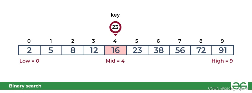 键(即 23)大于当前中间元素(即 16)。搜索空间向右移动。