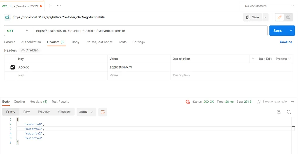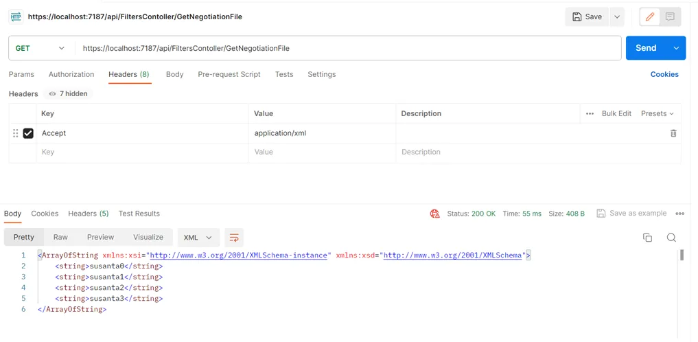 在这个配置中,首先我们需要告诉服务器尊重“accept”标头,并且我们添加了AddXmlSerializerFormatters()来支持响应中的XML格式。