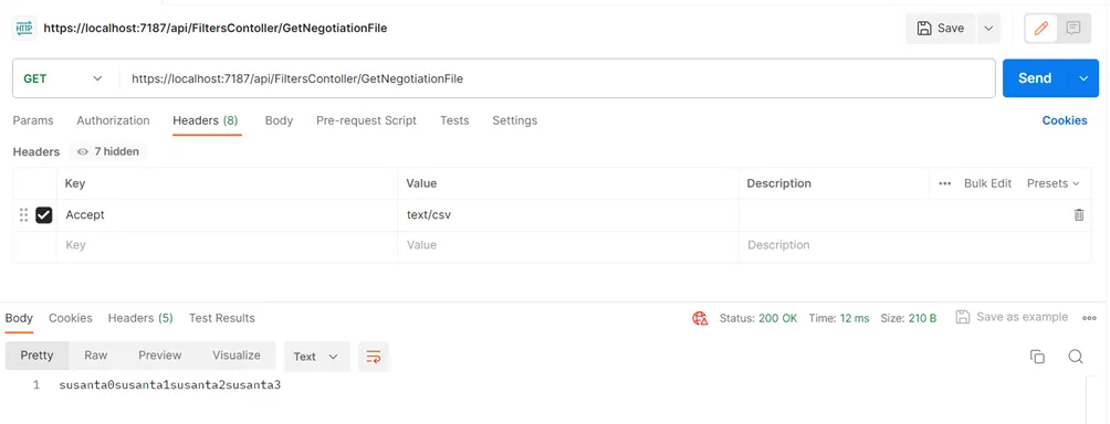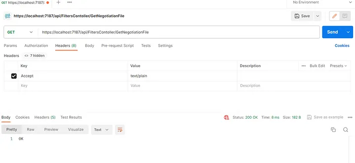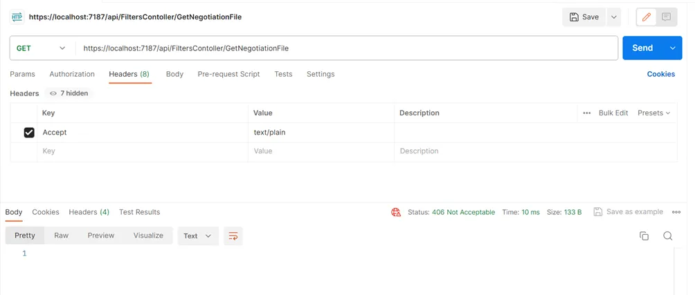 让我们去 Postman 并请求类型“ text/plain ”,如果我们的应用程序不支持它,那么它将给出错误代码406:不可接受。