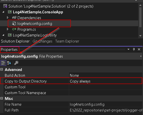 在我们检查配置文件的标签之前,不要忘记将属性“复制到输出目录”设置为“始终复制”。