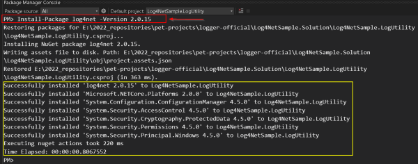 好的,打开包管理器控制台并安装 log4net 版本 2.0.15。
