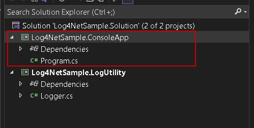 不要忘记将启动项目设置为“Log4NetSample.ConsoleApp”。在开始编码之前,我们需要使用控制台应用程序项目安装一个 NuGet 包“log4net”。