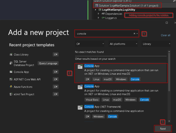 下一步,让我们创建一个新的控制台应用程序项目并使用我们创建的日志实用程序。