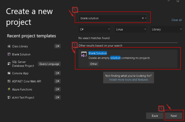 请参阅下面的屏幕截图以了解如何创建新的空白解决方案。