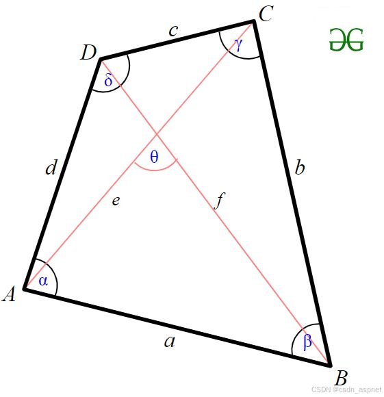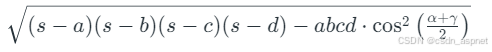 这里,a、b、c、d 是四边形的边长,s 是四边形的半周长,角是两个对角。