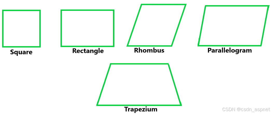 四边形就是至少有四条边的多边形。多边形是由四条线段组成的,这些线段在顶点处相交,形成四个或更多个角。四边形的例子有正方形、长方形、平行四边形、菱形、梯形。