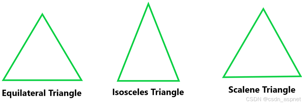 - 不等边三角形:如果三角形的三条边都不相等,则这种类型的三角形称为不等边三角形。