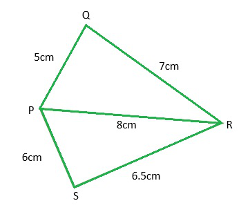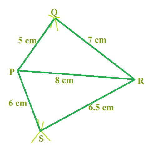 构造一个四边形 PQRS,其中 PQ= 5 厘米、QR = 7 厘米、RS = 6 厘米、PS = 6.5 厘米和 PR = 8 厘米。
