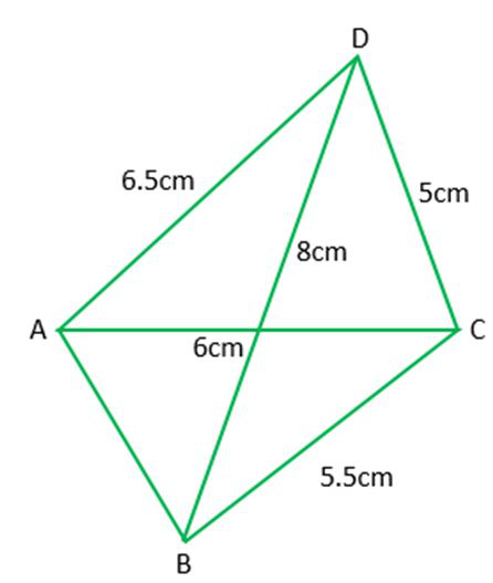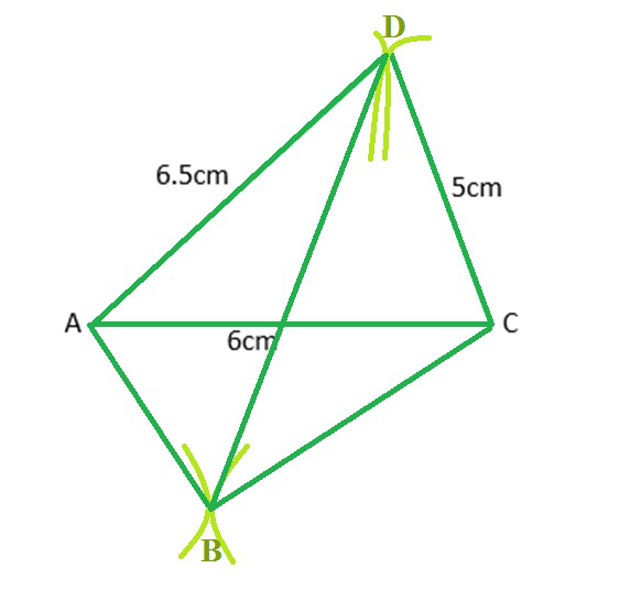 构造四边形 ABCD,已知 BC = 5.5 厘米,AD = 6.5 厘米,CD = 5 厘米,对角线 AC = 6 厘米,对角线 BD = 8 厘米。