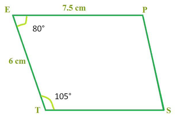 构造四边形 ABCD,其中 ST = 5 cm,TE = 6 cm,EP = 7.5 cm 且∠T = 105° 和∠E = 80°。
