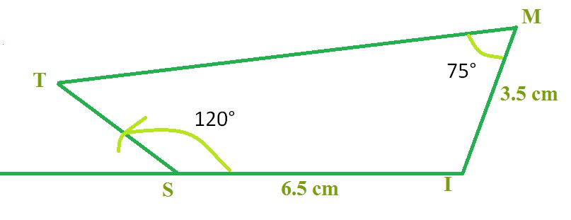 构造一个四边形 MIST,其中 MI = 3.5 厘米、IS = 6.5 厘米、∠M = 75°、∠I = 105° 和 ∠S = 120°。
