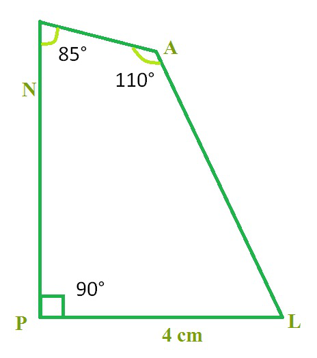 PL = 4 厘米、LA = 6.5 厘米、∠P = 90°、∠A = 110° 和 ∠N = 85 °