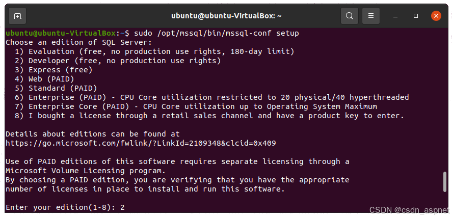 现在您已经在 Linux 发行版上安装了 SQL Server,您可以继续配置它。运行以下命令开始配置 SQL Server。