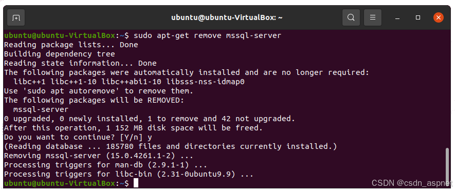 运行以下命令删除 Ubuntu 上的 mssql-server 包。