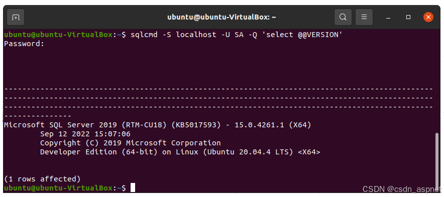 要检查 Ubuntu 上 SQL Server 的当前版本,请运行以下命令并在要求时提供 SQL Server 密码。