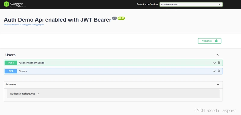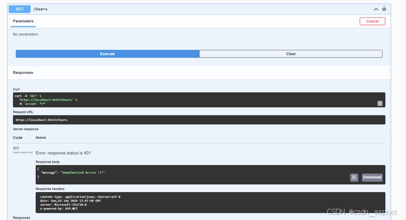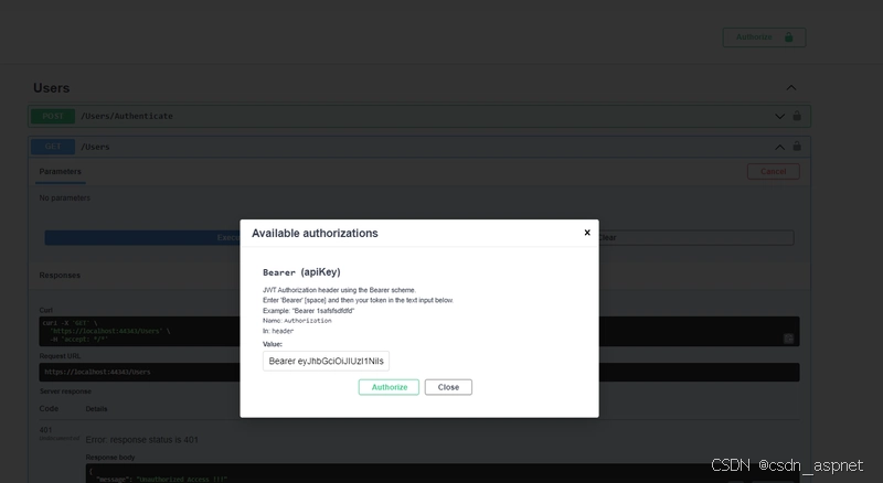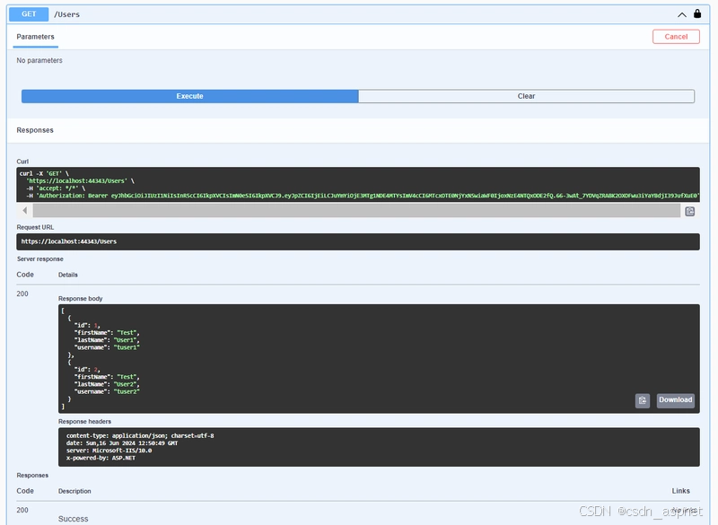 • GetAllAPI 返回所有用户,并添加Authorize属性将其置于 API 安全性之后。