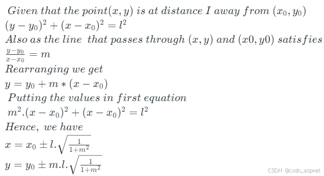 我们需要找到与给定点距离为 L 的两个点,它们位于斜率为 M 的直线上。