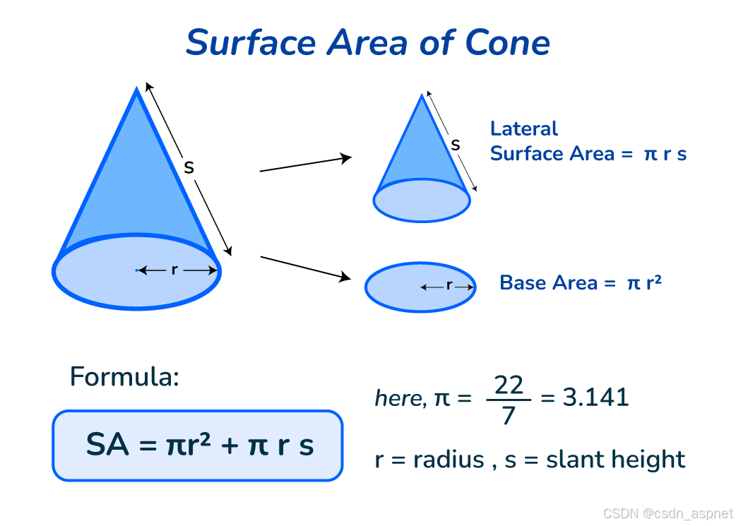 下面给出了圆锥体的图示以及计算表面积的公式: