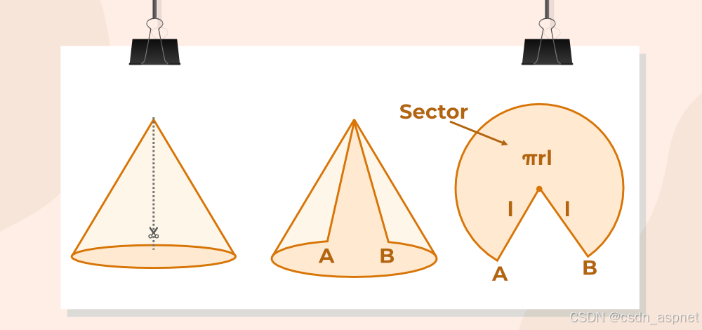 要观察圆锥表面形成的图形,取一个纸锥,沿其斜高剪开。现在,将 A 和 B 标记为两个端点,将 O 标记为两条线的交点。现在,如果我们打开它,它看起来就像一个圆的扇形。