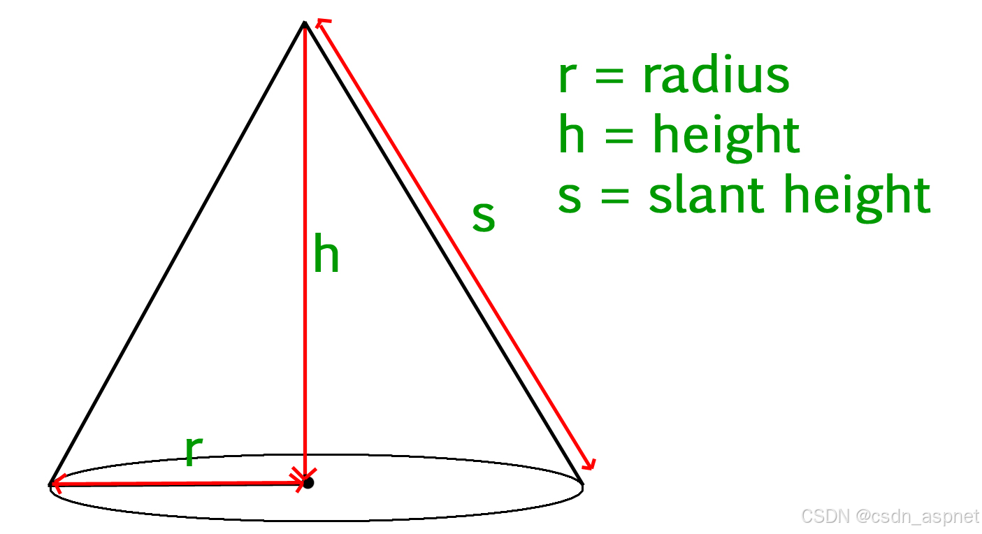其中r是圆形底面的半径,h是高度(从底面到顶点的垂直距离)。