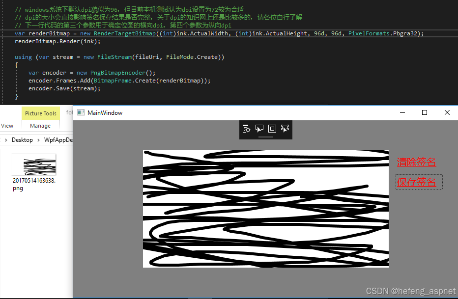 可以看出来,在后一个写法中以控件ink为基础,渲染了一个对应的Visual,我们将这个Visual放置在左上角,并最终用这个Visual来渲染出最终的截图。看看运行的效果: