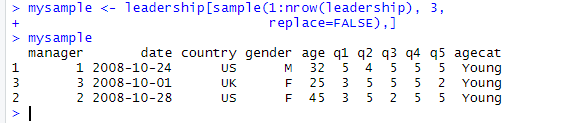 sample()函数中的第一个参数是一个由要从 中抽样的元素组成的向量。在这里,这个向量是1到数据框中观测的数量,第二个参数是要抽取的元素数量,第三个参数表示无放回抽样。