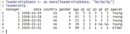 leadership$agecat[leadership$age >= 55 & leadership$age <= 75] <- "Middle Aged"