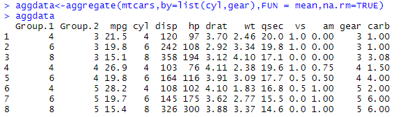 这个代码意思是:按照变量cyl,gear来分类别,属于相同类的所有数据各个变量取均值(执行FUN函数);group.1和group.2表示了分类值。