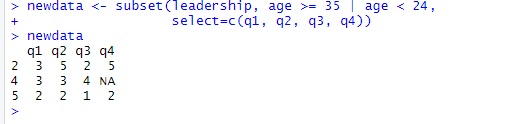 例,选择所有age值大于等于35或age值小于24的行,保留了变量q1到q4: