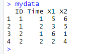mydata<-data.frame(x1 = c(2, 2, 6, 4), x2 = c(3, 4, 2, 8))