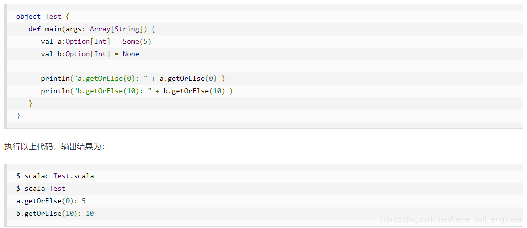 在Scala里Option[T]实际上是一个容器,就像数组或是List一样,你可以把他看成是一个可能有零到一个元素的List。