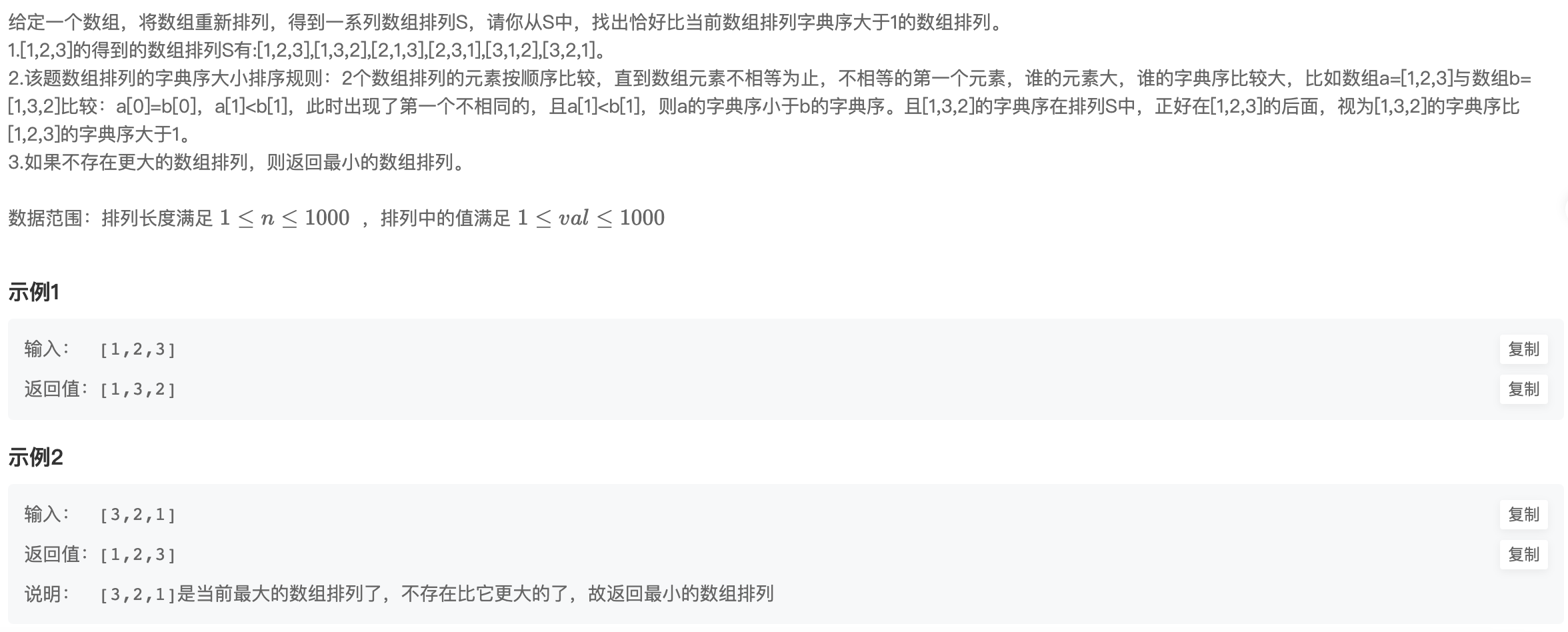 1.反向遍历当前排列,比如 排列A=[a,b,c,d,e,f...] ,当遍历到e时,说明以 a,b,c,d,e为前缀的排列中不存在A排列的下一个排列。