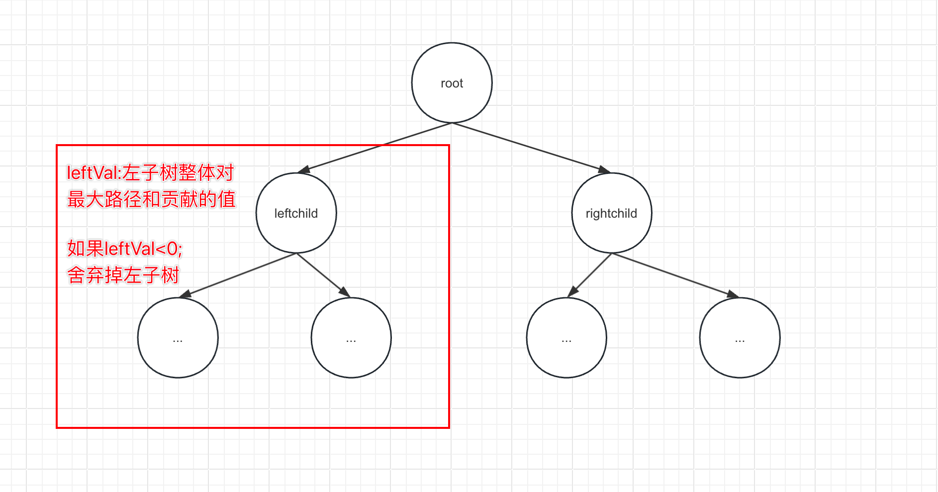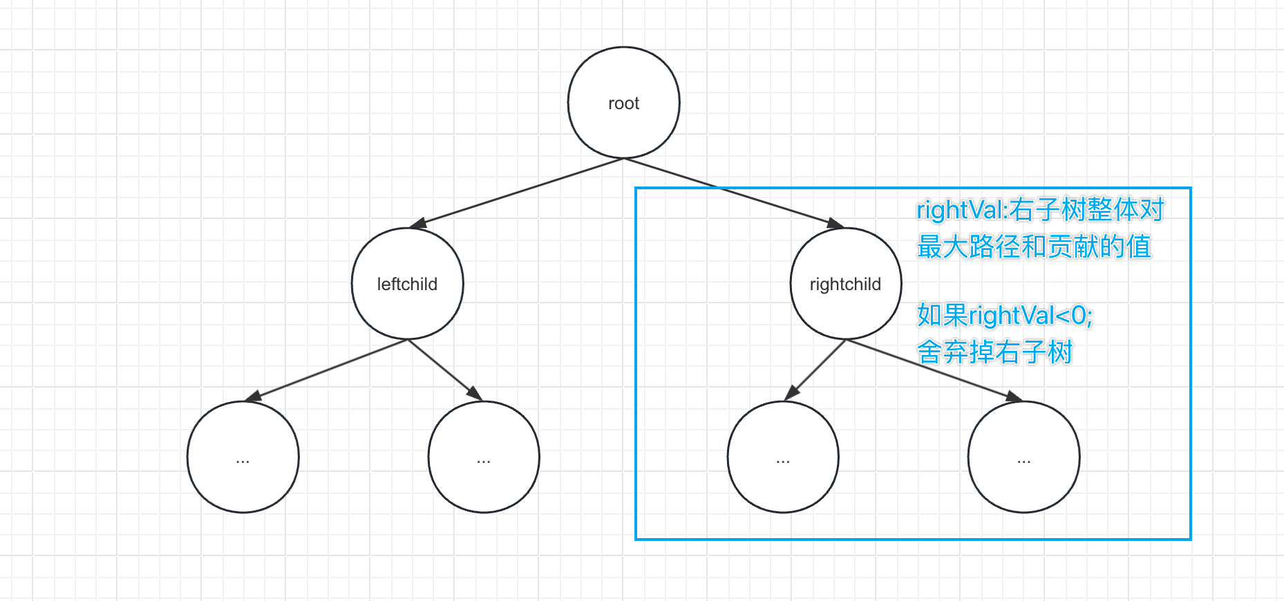 - 根节点+右子树:此时左子树贡献负值:蓝色箭头标识路径