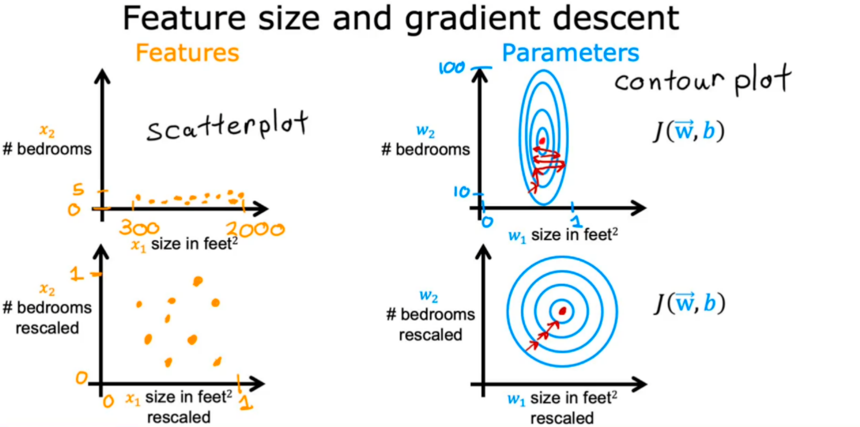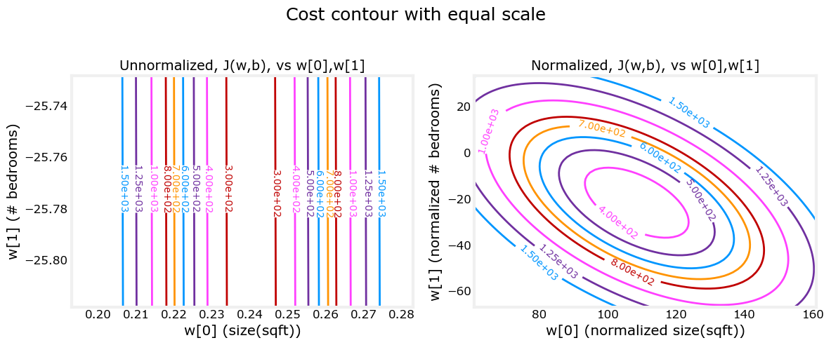 在下面的J(w,b)等值线图中,参数的比例是匹配的。左边的图是归一化特征前的w[0]平方英尺与w[1]的卧室数量对比图。这幅图太不对称了,无法看到补全轮廓的曲线。相反,当特征归一化后,代价轮廓更加对称。结果是,在梯度下降过程中对参数的更新可以对每个参数的变化取得相似的效果。