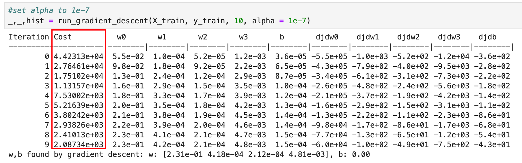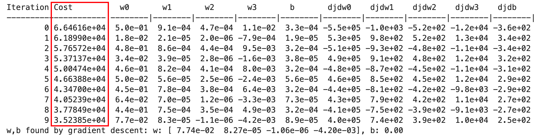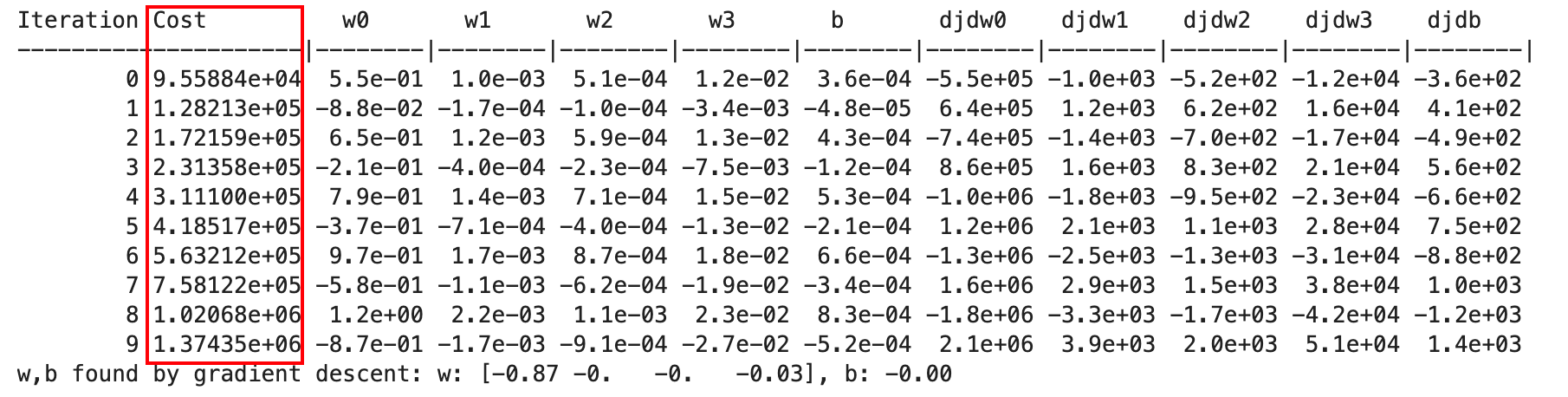 _, _, hist = run_gradient_descent(X_train, y_train, 10, alpha = 9.9e-7)