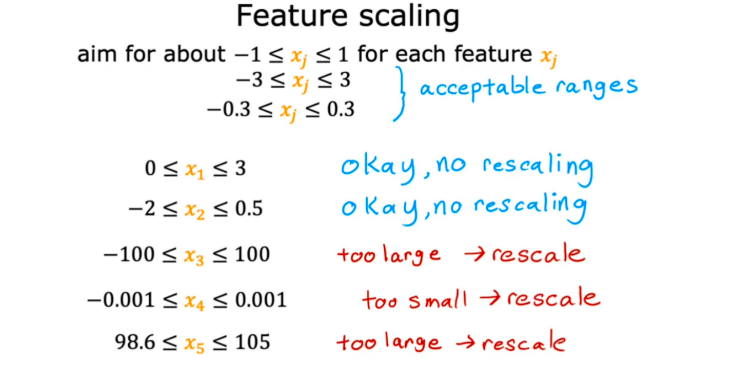 如果按原样训练数据。因为J(w,b)轮廓高而细,梯度下降可能会在结束前来回反弹了很长时间都没办法找到全局最小值的方法。在这种情况下,一个有用的要做的就是缩放特征。这意味着执行一些对训练数据进行变换,使x1的范围现在可以从0到1和x2的取值范围也可以是0到1。