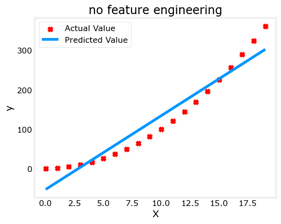 plt.scatter(x, y, marker='x', c='r', label="Actual Value"); plt.title("no feature engineering")