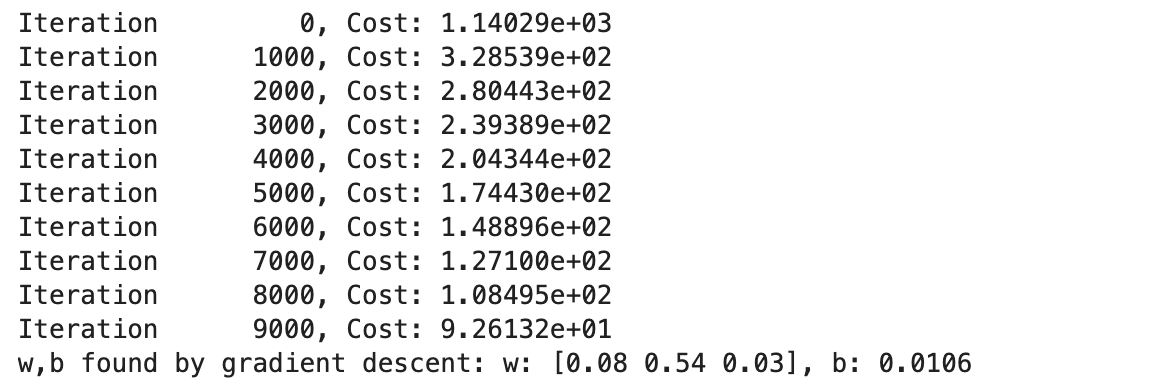 model_w,model_b = run_gradient_descent_feng(X, y, iterations=10000, alpha=1e-7)