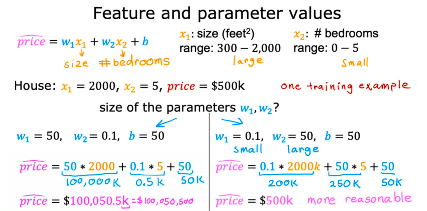 从上面可以看到,如果x1和x2两个特征差距太大,相应的w1和w2两个参数也会差距太大