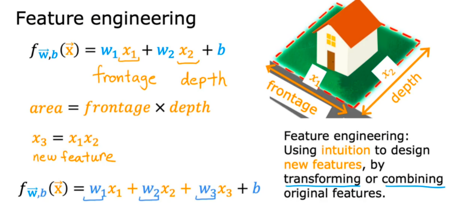 比如刚开始f(x)只是使用长和宽作为特征来构造线性回归模型,但是发现长×宽=面积引入后,面积更能决定房价,所以我们就可以完善我们的模型,将面积作为特征引入。