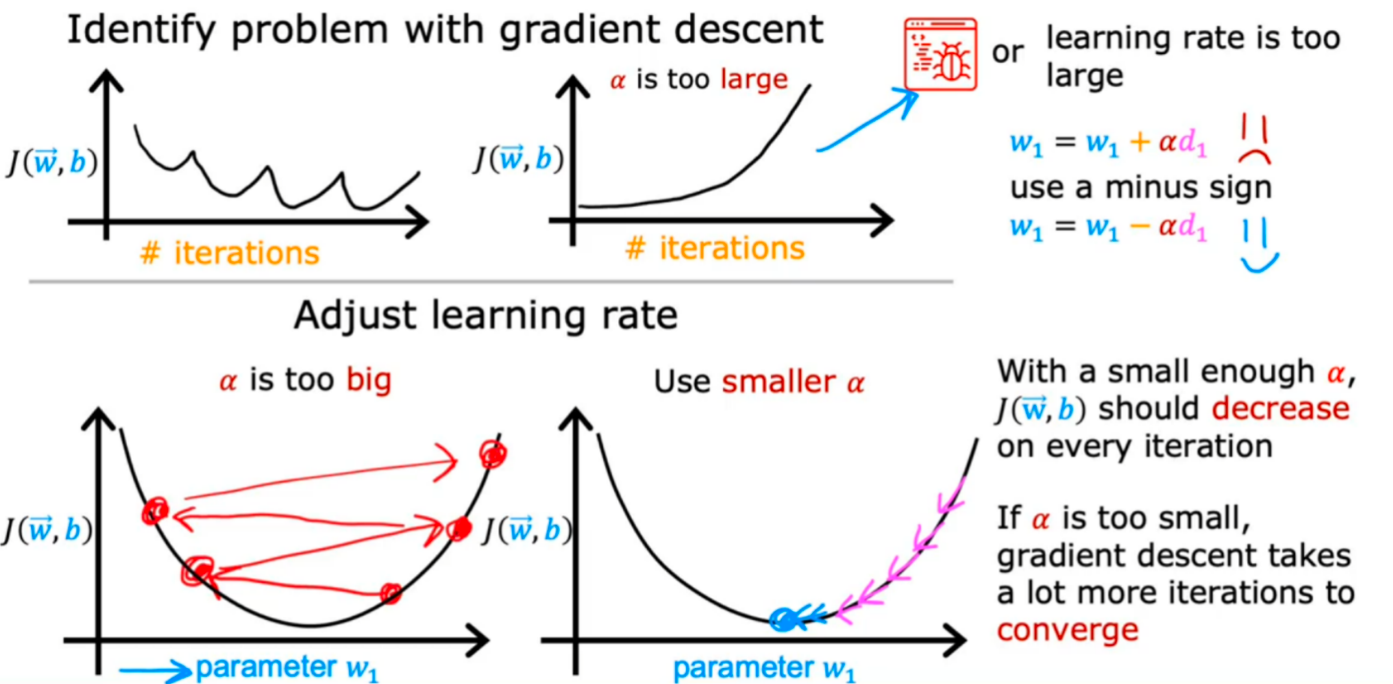 技巧:设置一个非常小的学习率α,如果在这样的学习率下还是会有J(w,b)在迭代中增加,此时就要注意程序内是否存在bug了,这里选择非常小的学习率只是一个调试过程,用于发现程序内可能存在的bug,但不是训练学习算法最好的选择(学习率太小可能会导致需要迭代很多次才能收敛)。